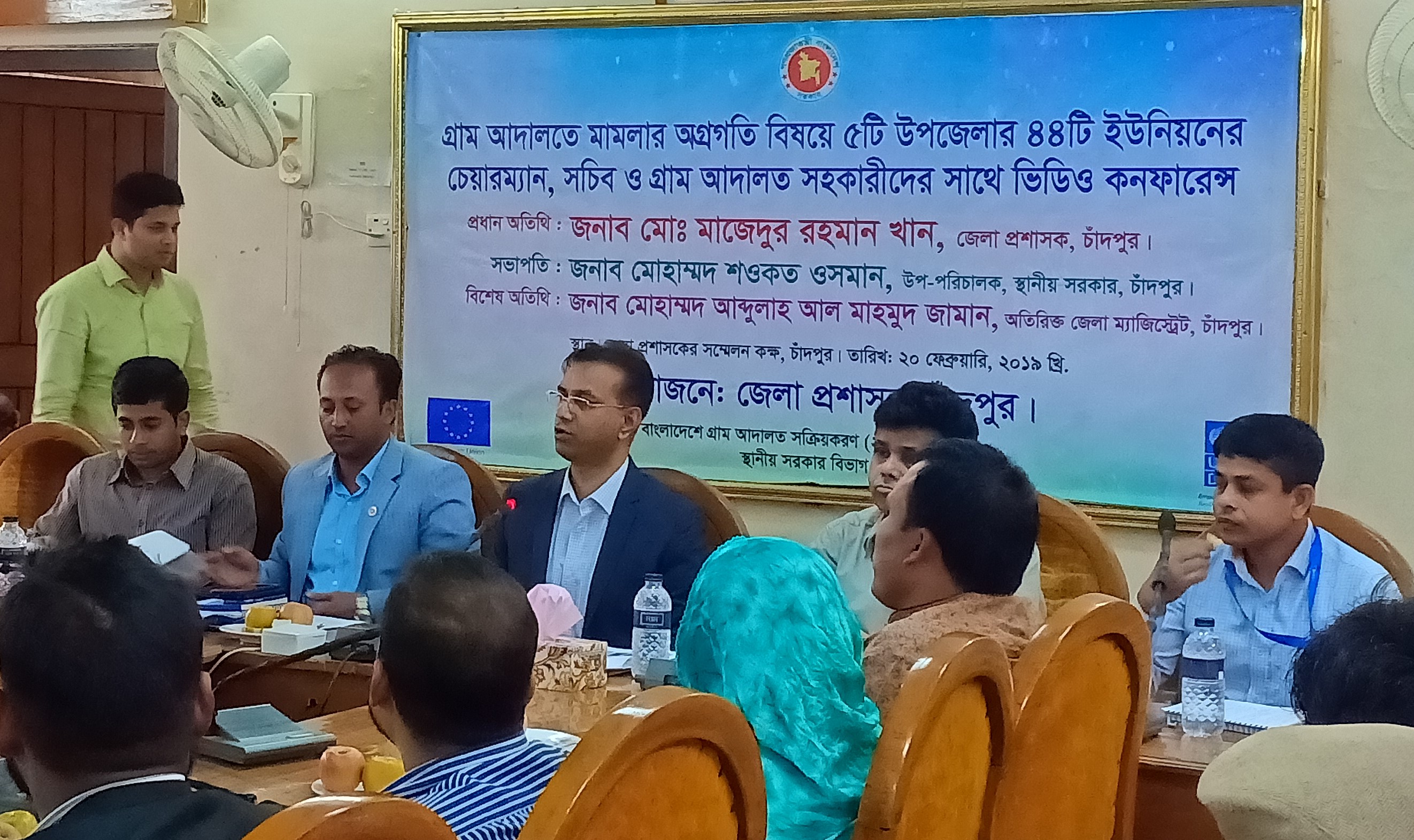 আজ বিকালে জেলা প্রশাসকের সম্মেলন কক্ষে কচুয়া, শাহরাস্তি, ফরিদগন্জ, মতলব-উত্তর ও মতলব-দক্ষিণ উপজেলার মোট ৪৪টি ইউনিয়নের চেয়ারম্যান, সচিব ও গ্রাম আদালত সহকারীদের সঙ্গে গ্রাম আদালতের অগ্রগতি ও বিভিন্ন চ্যালেন্জ নিয়ে একযোগে জেলা প্রশাসকের ভিডিও কনফারেন্স অনুষ্ঠিত হয়। এতে সভাপতিত্ব করেন অতিরিক্ত জেলা ম্যাজিস্ট্রেট মোহাম্মদ আব্দুলাহ আল মাহমুদ জামান। নিজ নিজ উপজেলা ভিডিও কনফারেন্সে নেতৃত্ব দেন উপজেলা নির্বাহী অফিসার ও সহকারী কমিশনার (ভূমি) বৃন্দ। এতে জেলা ও উপজেলায় একযোগে প্রায় ১৬০ জন অংশগ্রহণ করেন। প্রযুক্তির সুবিধা ব্যবহার করে উপজেলাগুলোর সঙ্গে এ ধরণের ভিডিও কনফারেন্স চাঁদপুরে এই প্রথম বারের মত অনুষ্ঠিত হল।