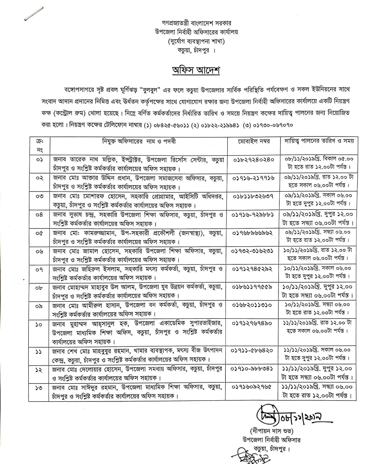 ০১৭৩০০৬৭০৭০ (উপজেলা নির্বাহী অফিসার)