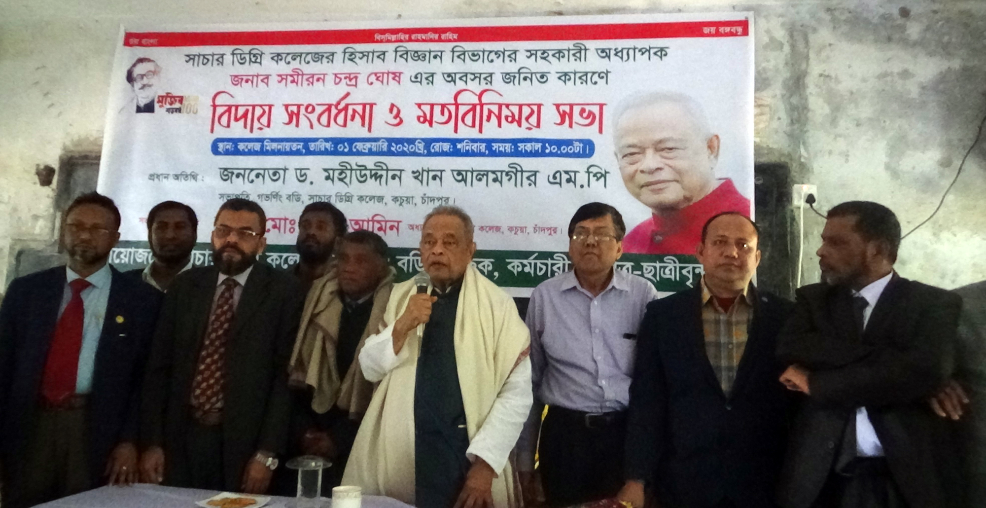 কচুয়ার সাচার ডিগ্রি কলেজের সহকারি অধ্যাপক সমীরন ঘোষের বিদায় সংবর্ধনা ও মতবিনিময় সভা অনুষ্ঠিত হয়েছে।১ফেব্রুয়ারি শনিবার ্র কলেজ কতৃক আয়োজিত বিদায়ী সবংর্ধনা অনুষ্ঠানে প্রধান অতিথি হিসেবে বক্তব্য রাখেন সাবেক স্বরাষ্ট্রমন্ত্রী ড.মহীউদ্দীন খান আলমগীর এমপি।কলেজের অধ্যক্ষ মো:নূরুল আমিনের সভাপ্রধানে ও সহকারী অধ্যাপক মো:মহসিন হোসেনের পরিচালনায় বিশেষ অতিথির বক্তব্য রাখেন কলেজের প্রতিষ্ঠাতা ও সাবেক এমপি অধ্রাপক ডাঃএকেএম শহিদুল ইসলাম,সংবর্ধিত বিদায়ী শিক্ষক হিসাব বিজ্ঞান বিভাগের সহকারী অধ্যাপক সমীরন চন্দ্র ঘোষ,কলেজ শাখা ছাত্রলীগের সভাপতি রাসেল মাহমুদ,শিক্ষার্থী তাহমিনা ।