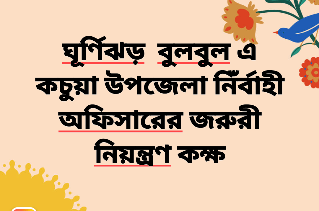 ঘূর্ণিঝড় “বুলবুল” এর কারণে দুর্যোগের জরুরি খবর আদান-প্রদানের জন্য উপজেলা নির্বাহী অফিসার, কচুয়া এর কার্যালয়ে ৮ নভেম্বর ” নিয়ন্ত্রণ কক্ষ” খোলা হয়েছে। সার্বক্ষনিক সবাইকে দুর্যোগ মোকাবেলায় সর্তকতা অবলম্বন ও নিরাপদে থাকার জন্যে পরামর্শ প্রদান করা হয়েছে। তাছাড়া কচুয়া উপজেলায় প্রয়োজনে ১৮ টি স্থায়ী ও ৩০টি অস্থায়ী সাইক্লোন সেন্টার প্রস্তুত রাখা হয়েছে ।